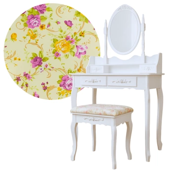 Miękkie siedzisko o wymiarach 44 × 38 × 28 cm, obite tkaniną z kwiatowym wzorem, gwarantuje wygodę nawet podczas dłuższych rytuałów pielęgnacyjnych. Stylowe uzupełnienie toaletki.