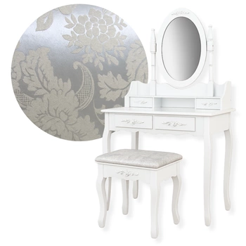 - Stylowa biała toaletka kosmetyczna MISTY z owalnym, obrotowym lustrem, 4 szufladami i wygodnym taboretem. Elegancki design i praktyczne rozwiązania – idealna do sypialni i garderoby.
