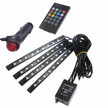 - Zestaw oświetlenia LED RGB do wnętrza samochodu, 36 punktów świetlnych. Samoprzylepne, wodoodporne listwy z funkcją oświetlenia w rytm muzyki. Sterowanie pilotem lub telefonem. Łatwy montaż, zasilanie 12V z zapalniczki. 4 tryby świecenia.