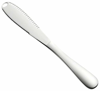 Stalowy nóż do masła o długości 20,5 cm. Wyposażony w dziurki ułatwiające nabieranie i rozsmarowywanie zimnego masła. Wykonany ze stali nierdzewnej co gwarantuje długie i bezproblemowe użytkowanie. Wygodny nóż do masła to niezbędne wyposażenie każdej kuchni.