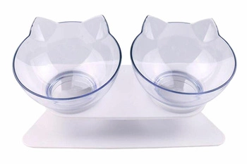 Podwójna miska na jedzenie i wodę dla kotów. Miski zostały umieszczone na specjalnej podstawce nachylonej pod kątem 15 stopni w stronę zwierzęcia, ułatwiając mu pobieranie wody i pokarmu. Przemyślana konstrukcja stojaka zapobiega rozlaniu się wody oraz rozsypaniu pokarmu. Przezroczyste miseczki ułatwiają sprawdzenie ilości pozostałego we wnętrzu jedzenia. Schludny wygląd, miski będą pasowały do każdej kuchni i przedpokoju.