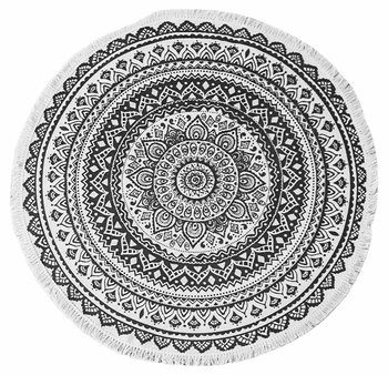 - Okrągły dywanik w stylu boho z frędzlami, wykonany z miękkiego materiału. Doskonały do salonu czy przedpokoju, ociepla wnętrze i nadaje mu przytulny charakter.