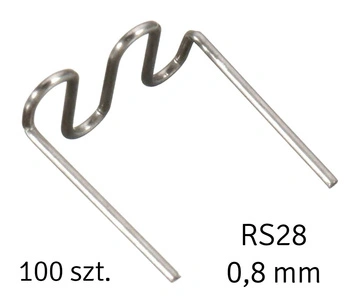 Zestaw 100 zszywek przeznaczonych do zgrzewarek i spawarek plastiku. Zszywki typu RS28 (duża fala) o średnicy 0,8 mm. Wykonane z solidnej stali nierdzewnej.