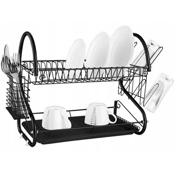 - Pojemna, dwupoziomowa suszarka do naczyń ze stali nierdzewnej. Mieści 15 talerzy, kubki i szklanki. Wyposażona w tackę ociekową, koszyk na sztućce i wieszak na 6 szklanek. Idealna do każdej kuchni.