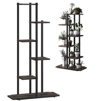 - Wielopoziomowy kwietnik z 6 drewnianymi półkami i stalową konstrukcją. Doskonały do aranżacji roślin zarówno wewnątrz, jak i na zewnątrz. Stabilny i funkcjonalny, z szeroką dolną półką. Idealny do ogrodu, tarasu lub mieszkania.