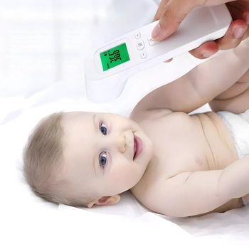 Elektroniczny, bezdotykowy termometr na podczerwień przeznaczony dla całej rodziny. Produkt przeznaczony jest w szczególności do pomiarów temperatury ciała u małych dzieci – jest niezwykle szybki i nieinwazyjny. Pomiar temperatury wykonany jest poniżej 2 sekund po przybliżeniu urządzenia do czoła. Dziecko nie zdąży nawet zwrócić na to uwagi, co zdecydowanie ułatwia sprawdzenie temperatury. Wyposażony w czytelny wyświetlacz LCD zmieniający kolor zależnie od poziomu temperatury. Z łatwością zmierzysz temperaturę dziecka podczas snu – bez stresu i płaczu. Prosty i intuicyjny w obsłudze – stanowi świetną alternatywę dla tradycyjnych termometrów.