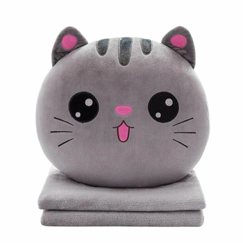 - Urocza maskotka–poduszka w kształcie kotka z miękkim kocem 110×160 cm w środku. Miękka, przytulna i praktyczna – idealna do domu, podróży lub jako prezent.