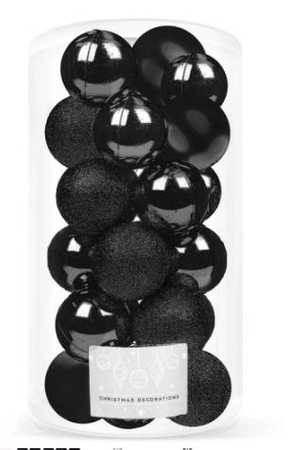 - Zestaw 20 czarnych bombek 4 cm z nietłukącego tworzywa. Matowe, błyszczące i brokatowe, gotowe do zawieszenia. Stylowe i bezpieczne ozdoby do nowoczesnych aranżacji świątecznych.