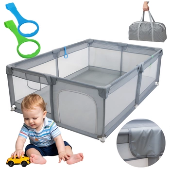 Kojec dla dziecka 200x140 cm XL – duży plac zabaw z siatką, wejście na zamek, uchwyty do nauki chodzenia, szary + torba transportowa