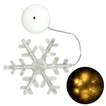 - Lampka świąteczna LED w kształcie płatka śniegu. 10 ciepłych diod, zasilanie na baterie, przyssawka do montażu. Idealna dekoracja okna, stołu lub witryny.