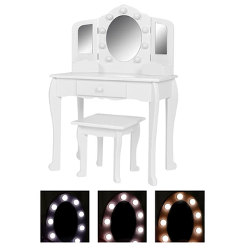 - Biała toaletka dla dziewczynki z potrójnym lustrem i 9 lampkami LED. Regulacja barwy światła, szuflada, półki i taboret tworzą idealne miejsce do zabawy i pielęgnacji.