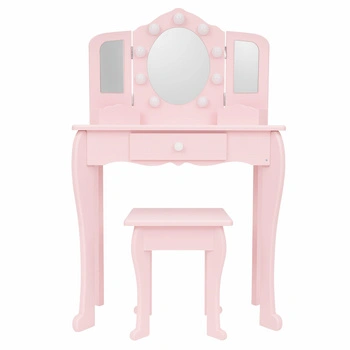 - Różowa toaletka dla dziewczynki z potrójnym lustrem i 9 lampkami LED. Regulacja barwy światła, szuflada i taboret w zestawie tworzą idealne miejsce do zabawy i stylizacji.
