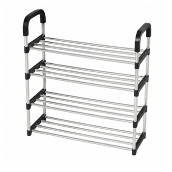 - Lekki i stabilny regał na buty z 4 półkami. Metalowa konstrukcja z elementami PP odporna na wilgoć, kompaktowe wymiary idealne do przedpokoju i garderoby. Szybki montaż, nowoczesny design czarno-srebrny.