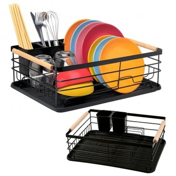 Ociekacz do naczyń z tacką i drewnianymi uchwytami – metalowy czarny